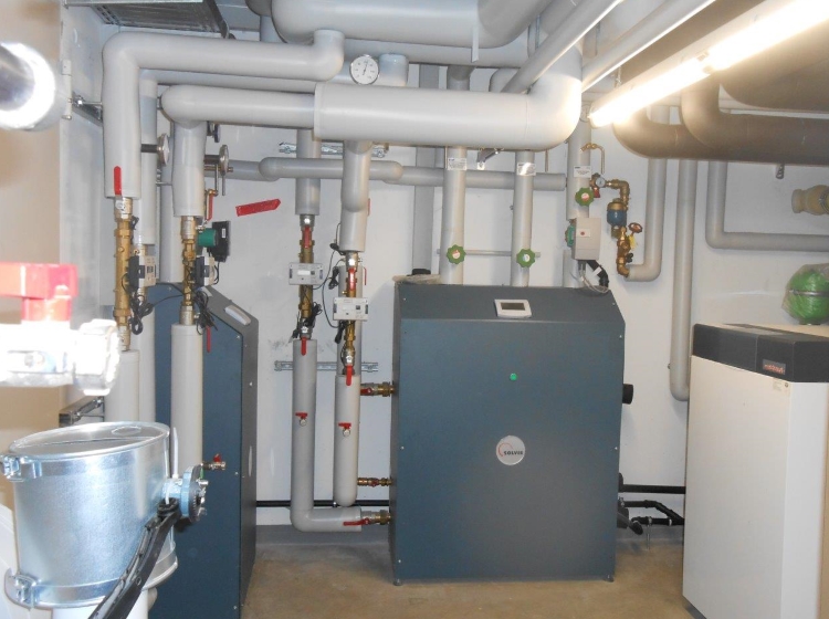 Grundlast: 2 x 90 kW Gas-Brennwertkessel, 1.500 Liter Pufferspeicher, 30 m2 Solaranlage, Frischwasserstationen